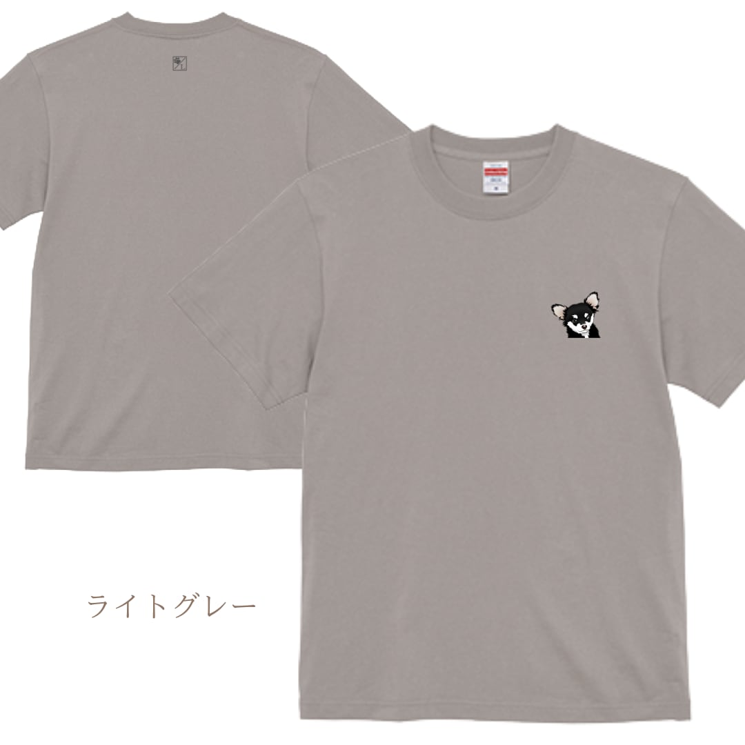 このTシャツには、愛らしい子犬の似顔絵がデザインされています。