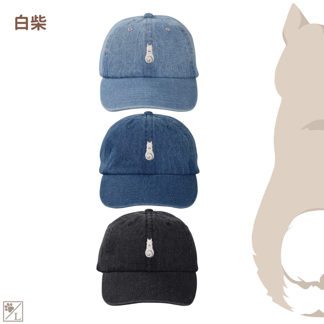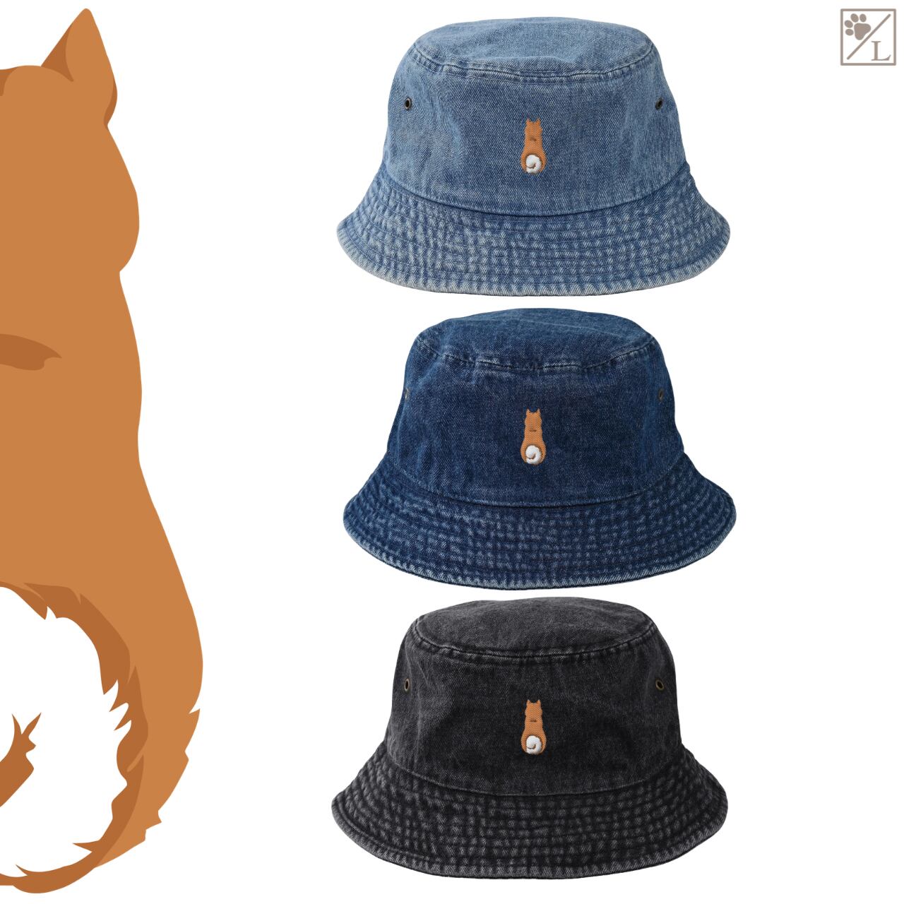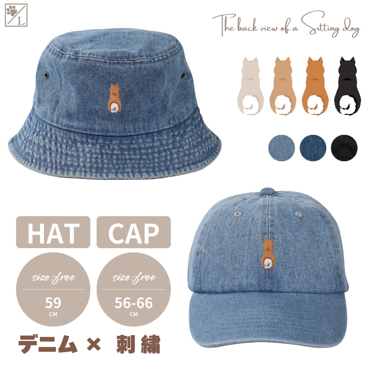 犬のおすわり後ろ姿を刺繍であしらった、シンプルで使いやすいデニムキャップ&ハットです。