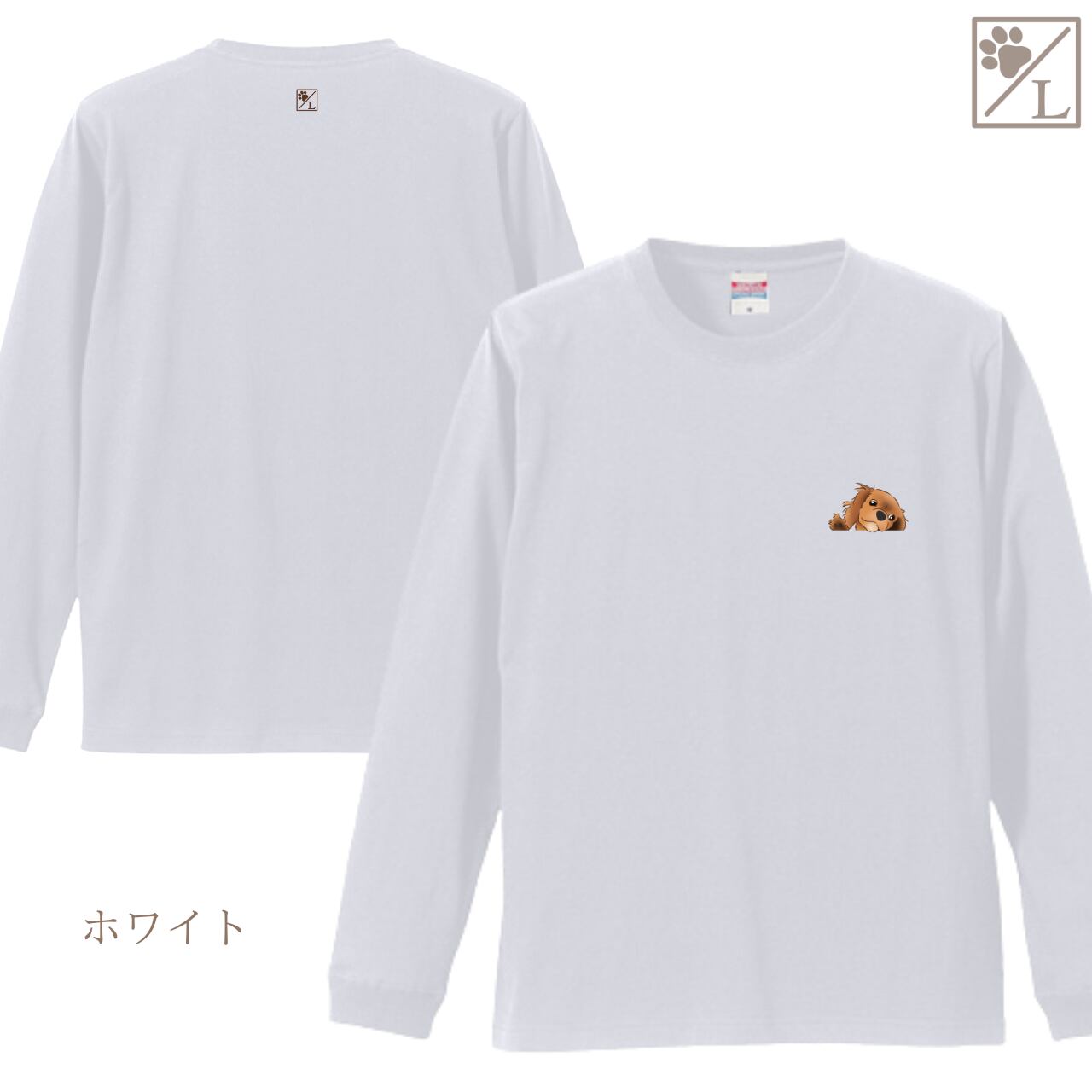 このロンTには、愛らしい子犬の似顔絵がデザインされています。