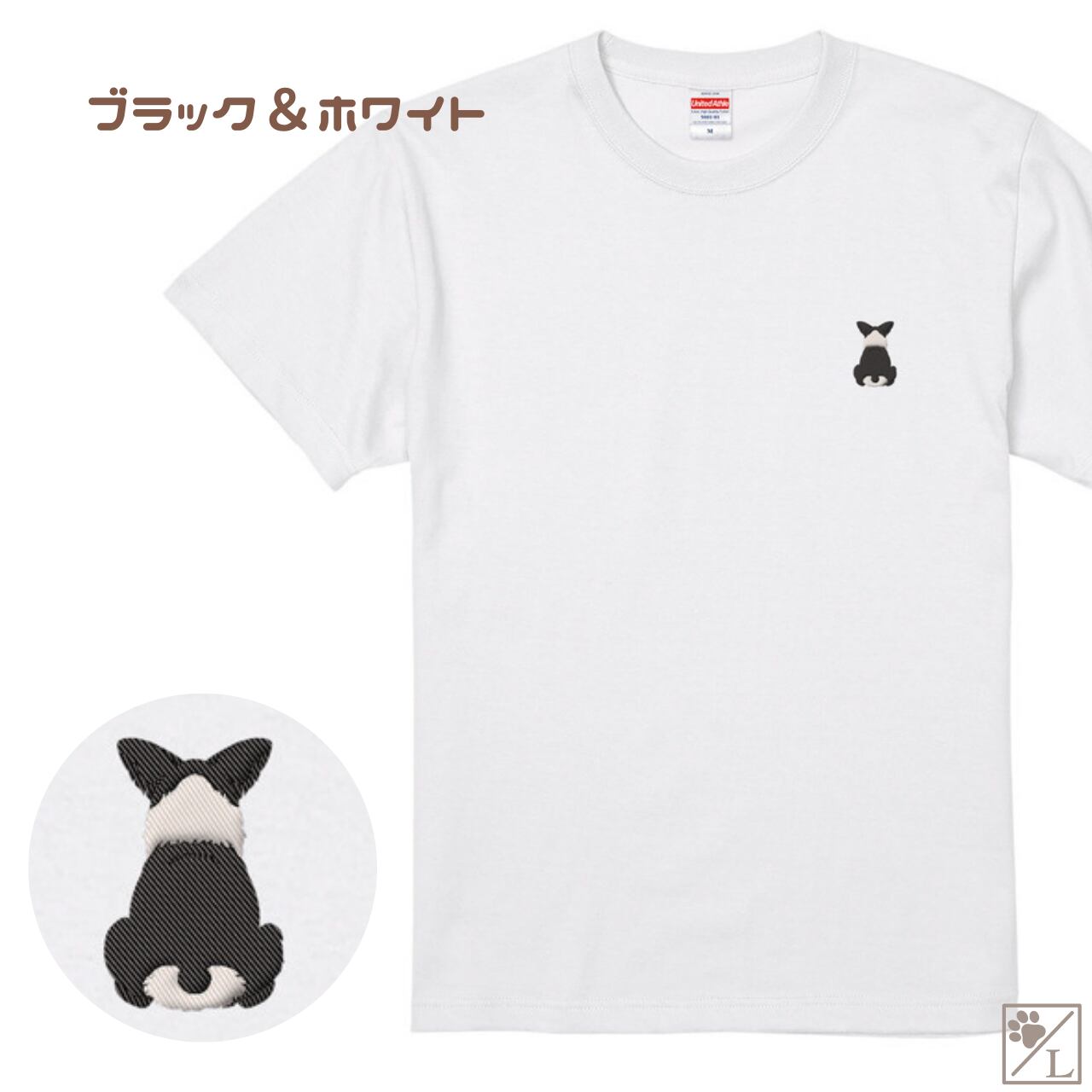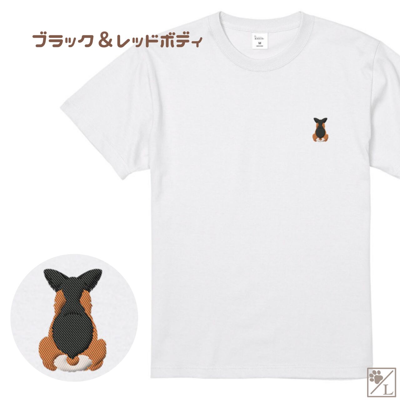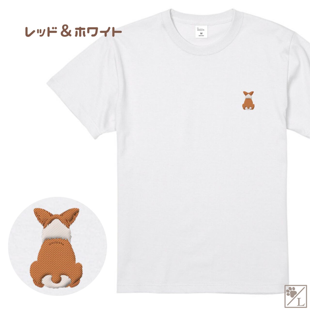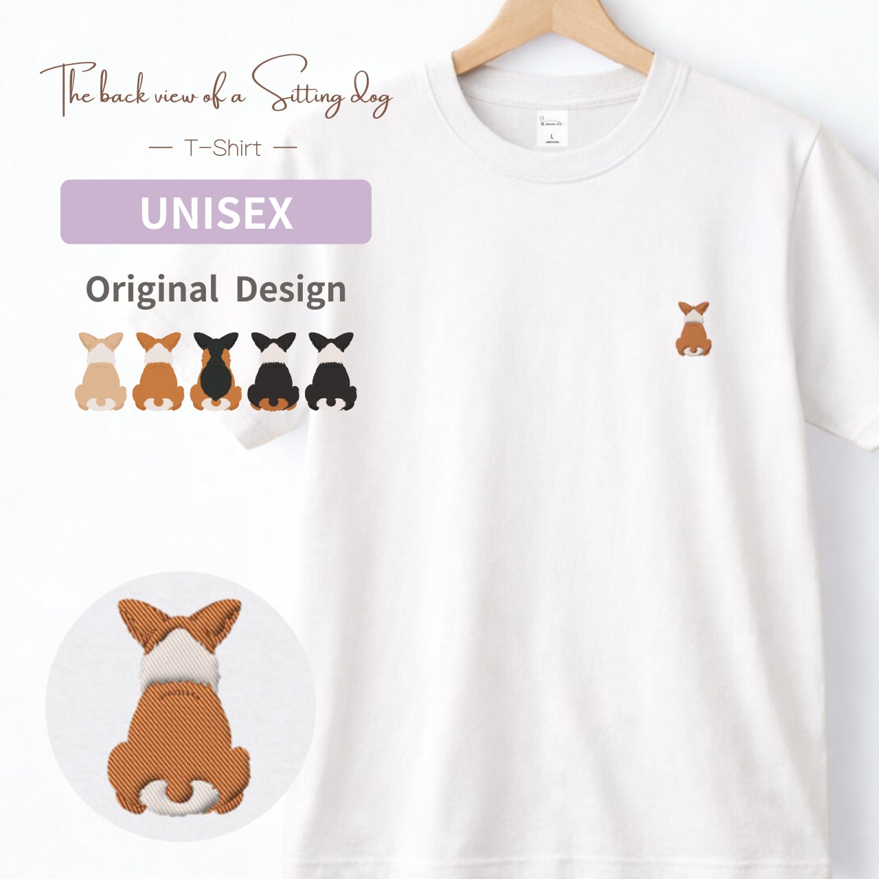 【ウェルシュコーギーペンブローク】コーギー ペンブローク おすわり犬の後ろ姿 刺繍ワンポイントTシャツ|ユニセックス|オリジナルデザイン