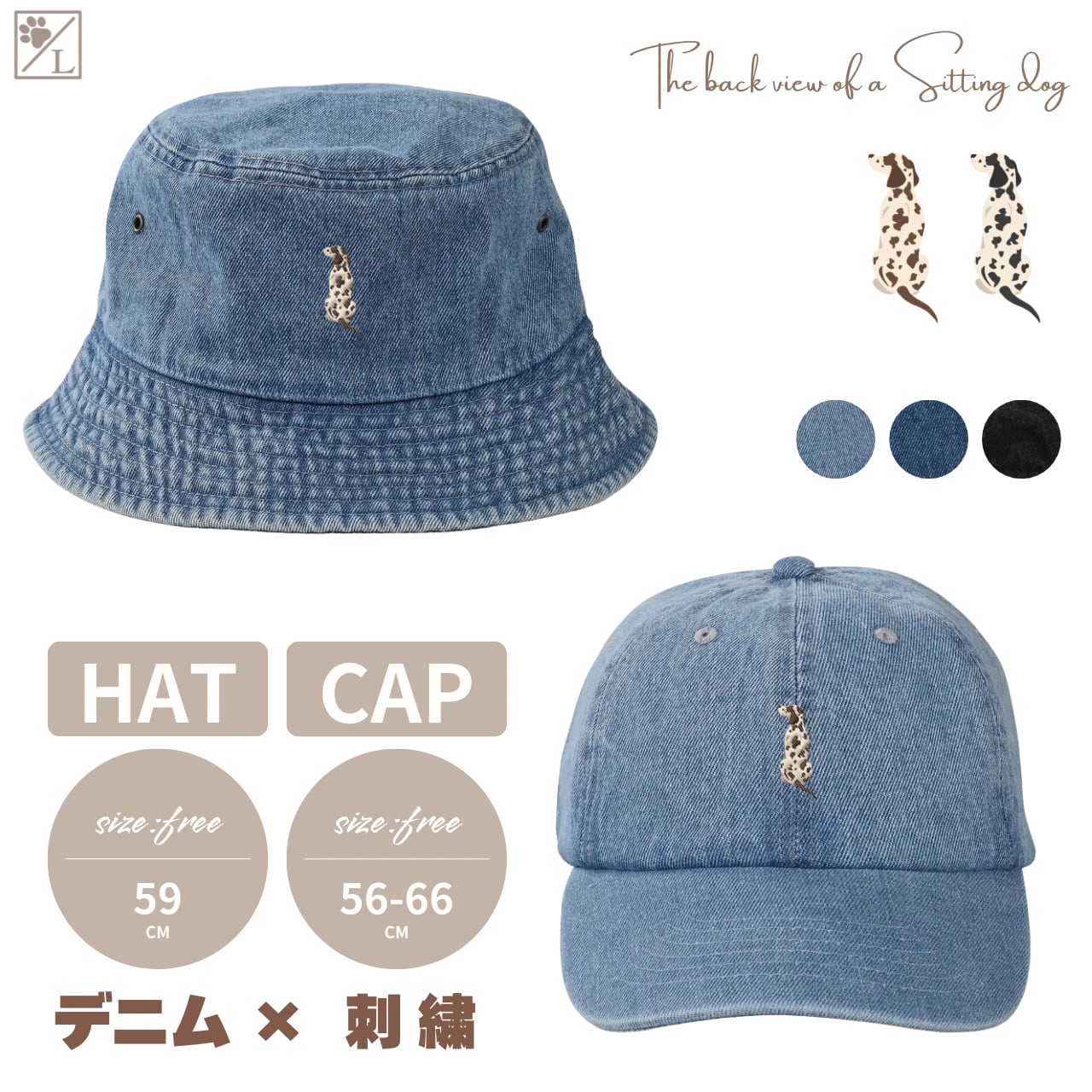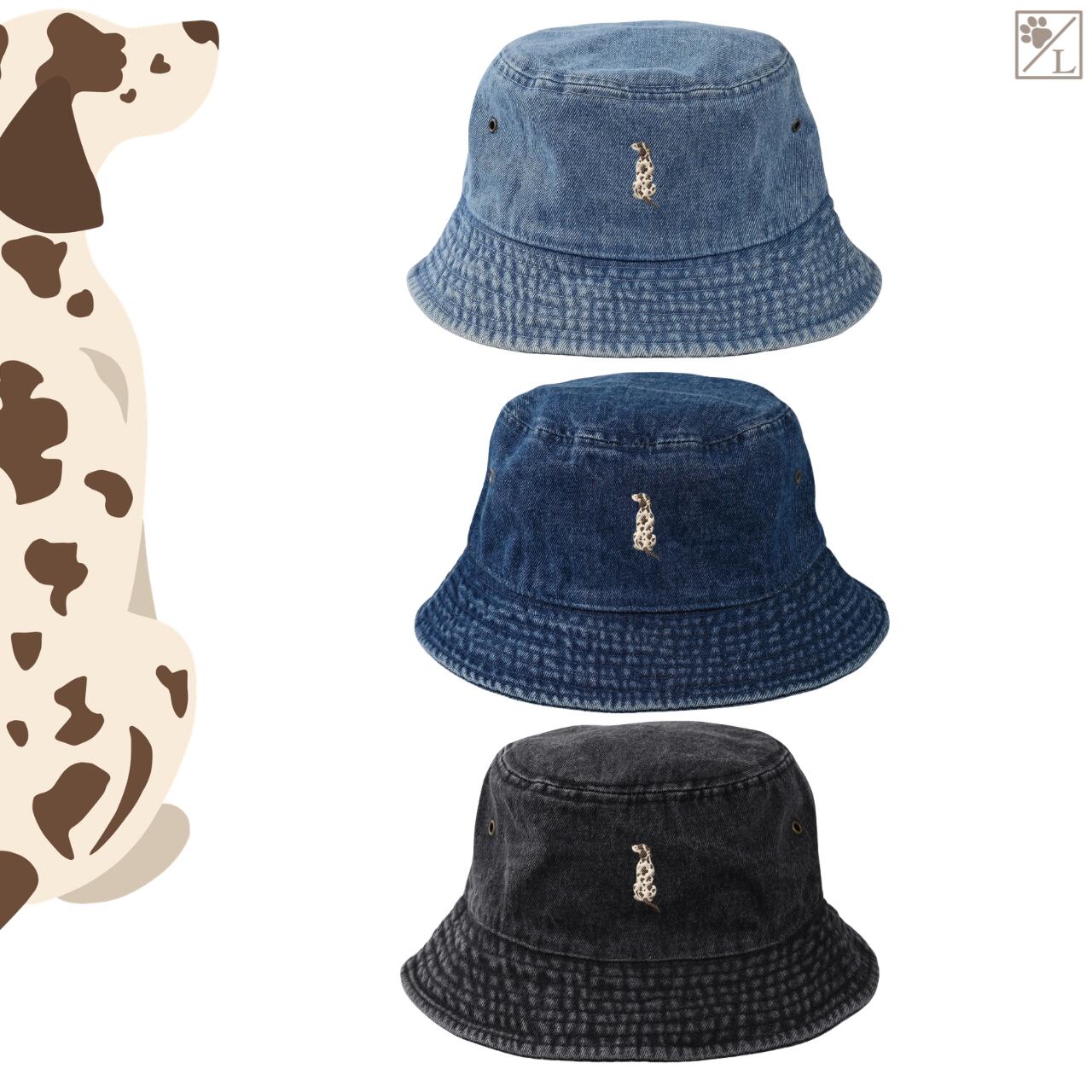 【ダルメシアン】刺繍 犬の後ろ姿デニムキャップ・バケットハット|選べる3色|愛犬家に人気の帽子