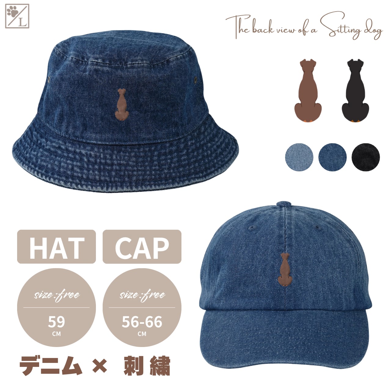 犬のおすわり後ろ姿を刺繍であしらった、シンプルで使いやすいデニムキャップ&ハットです。