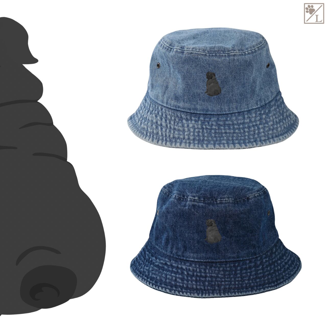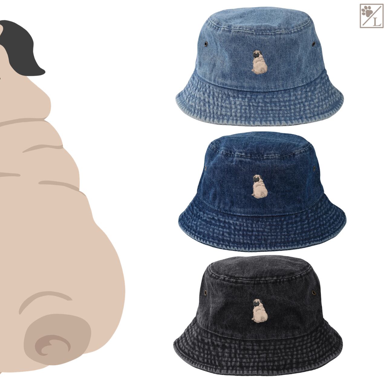 【パグ】刺繍 犬の後ろ姿デニムキャップ・バケットハット|選べる3色|愛犬家に人気の帽子