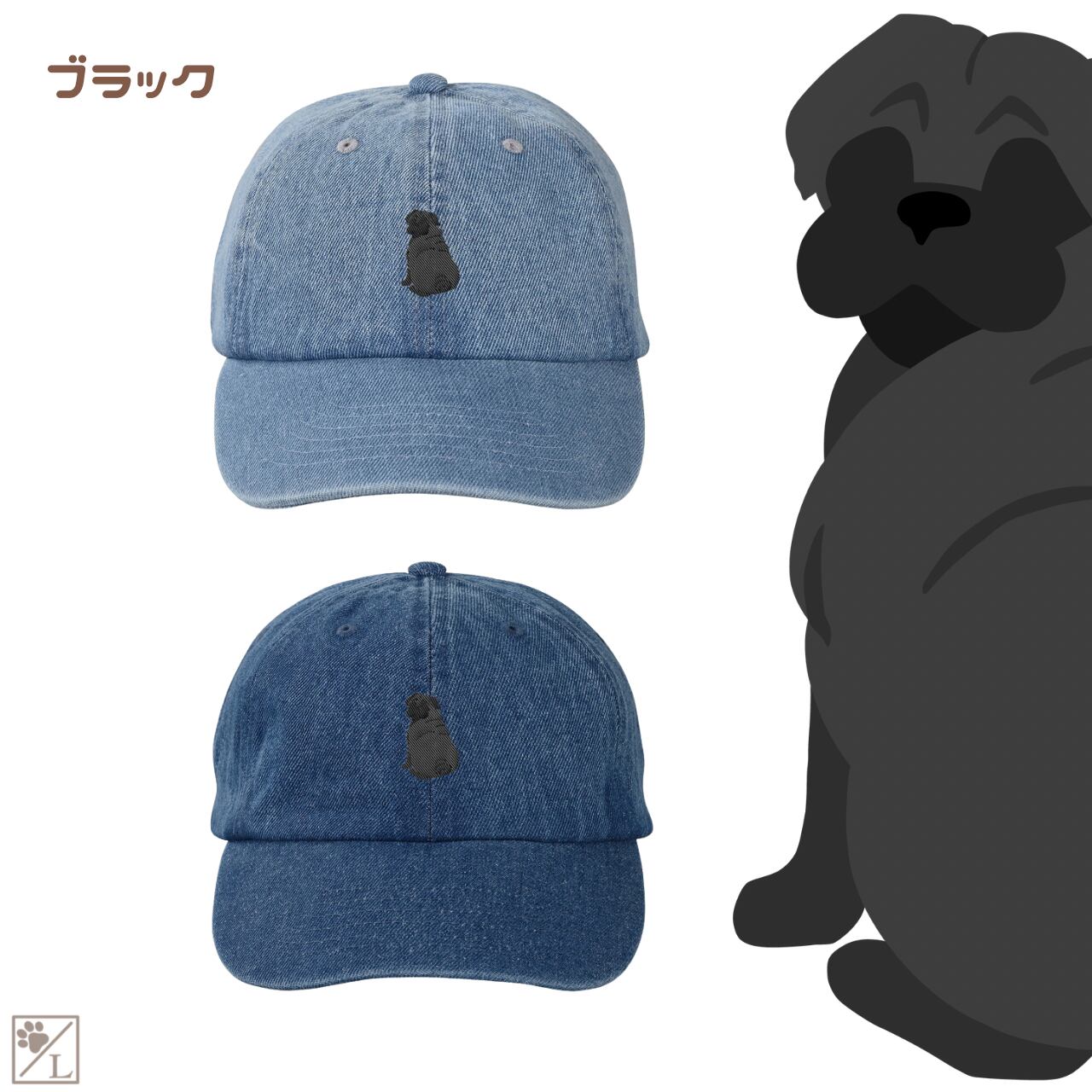 犬のおすわり後ろ姿を刺繍であしらった、シンプルで使いやすいデニムキャップ&ハットです。