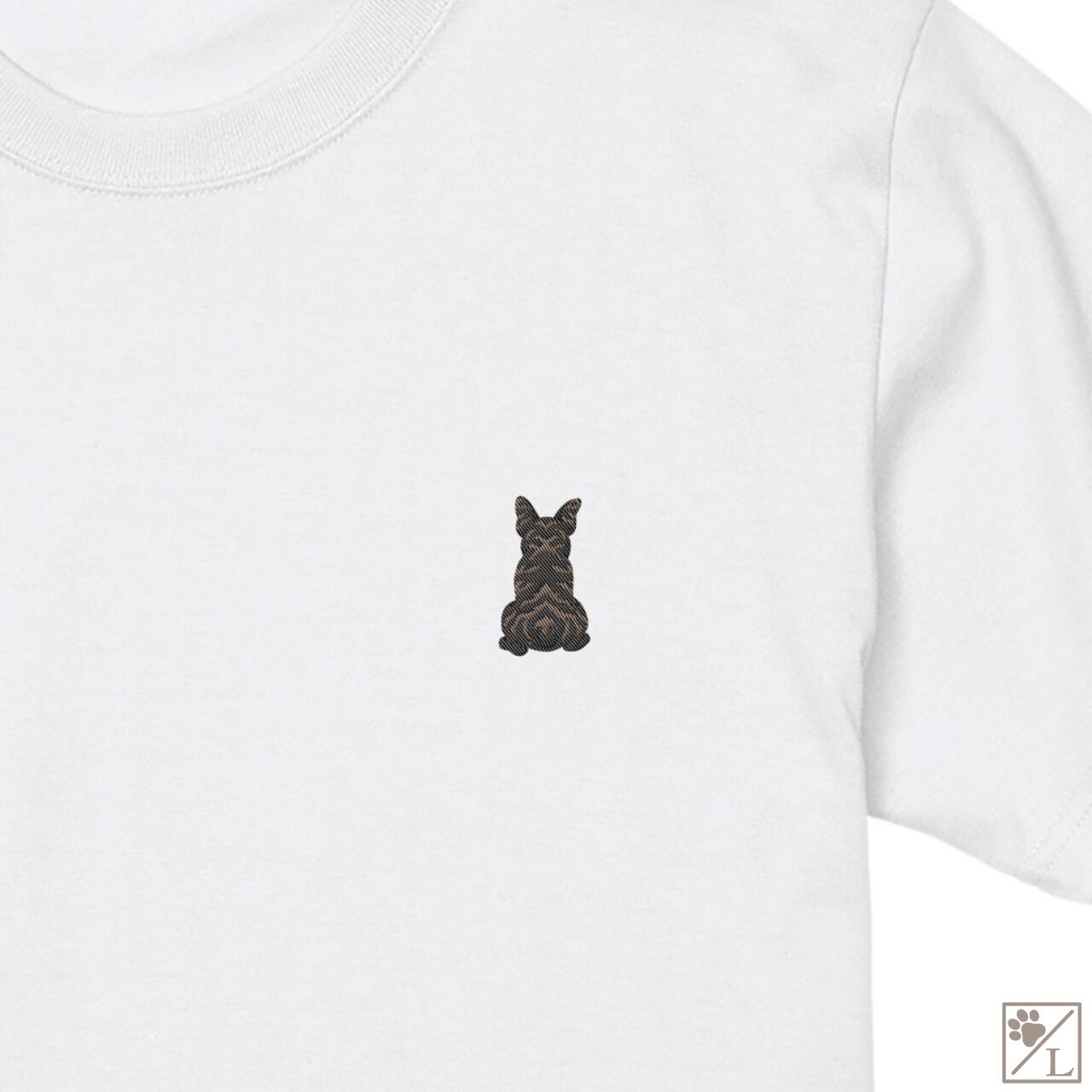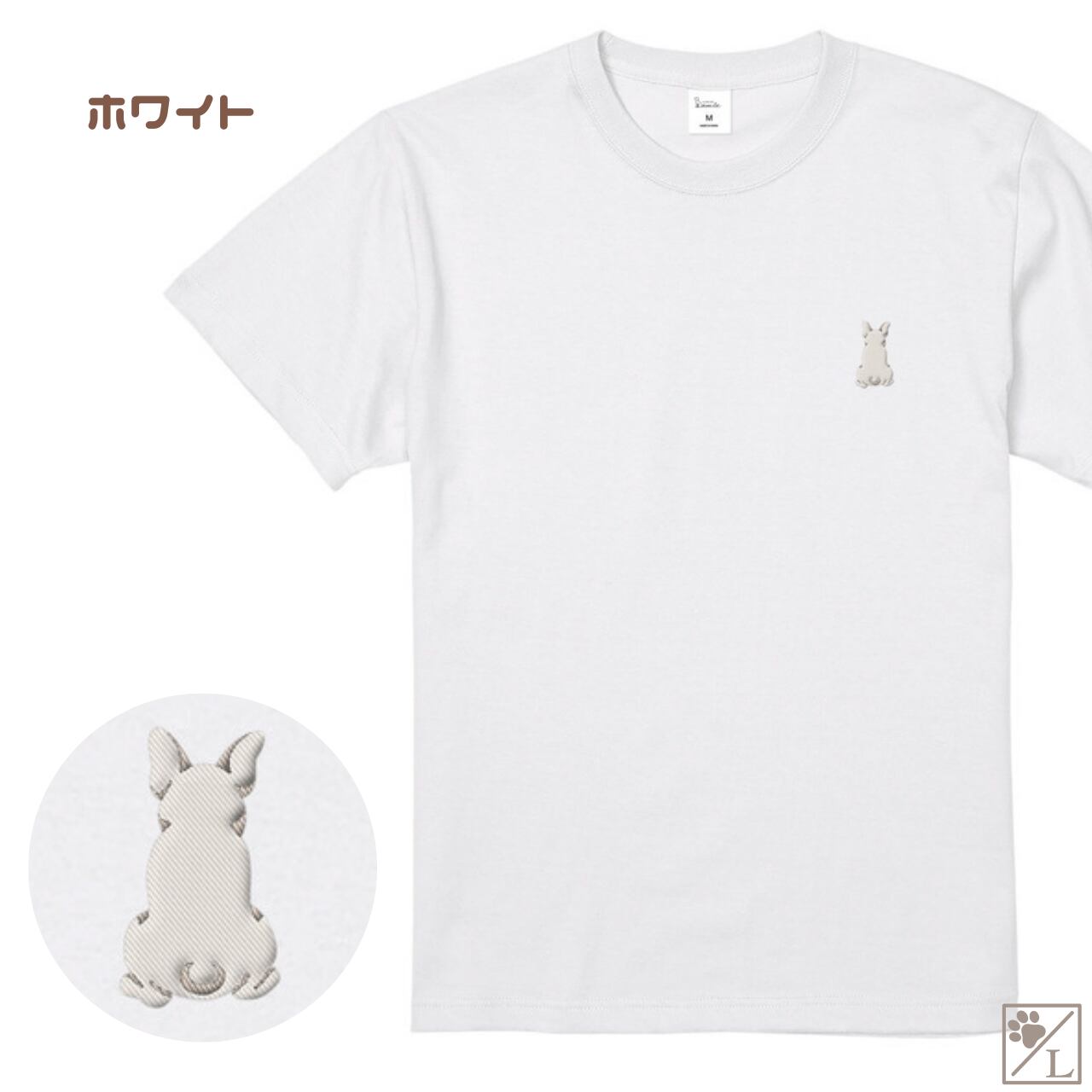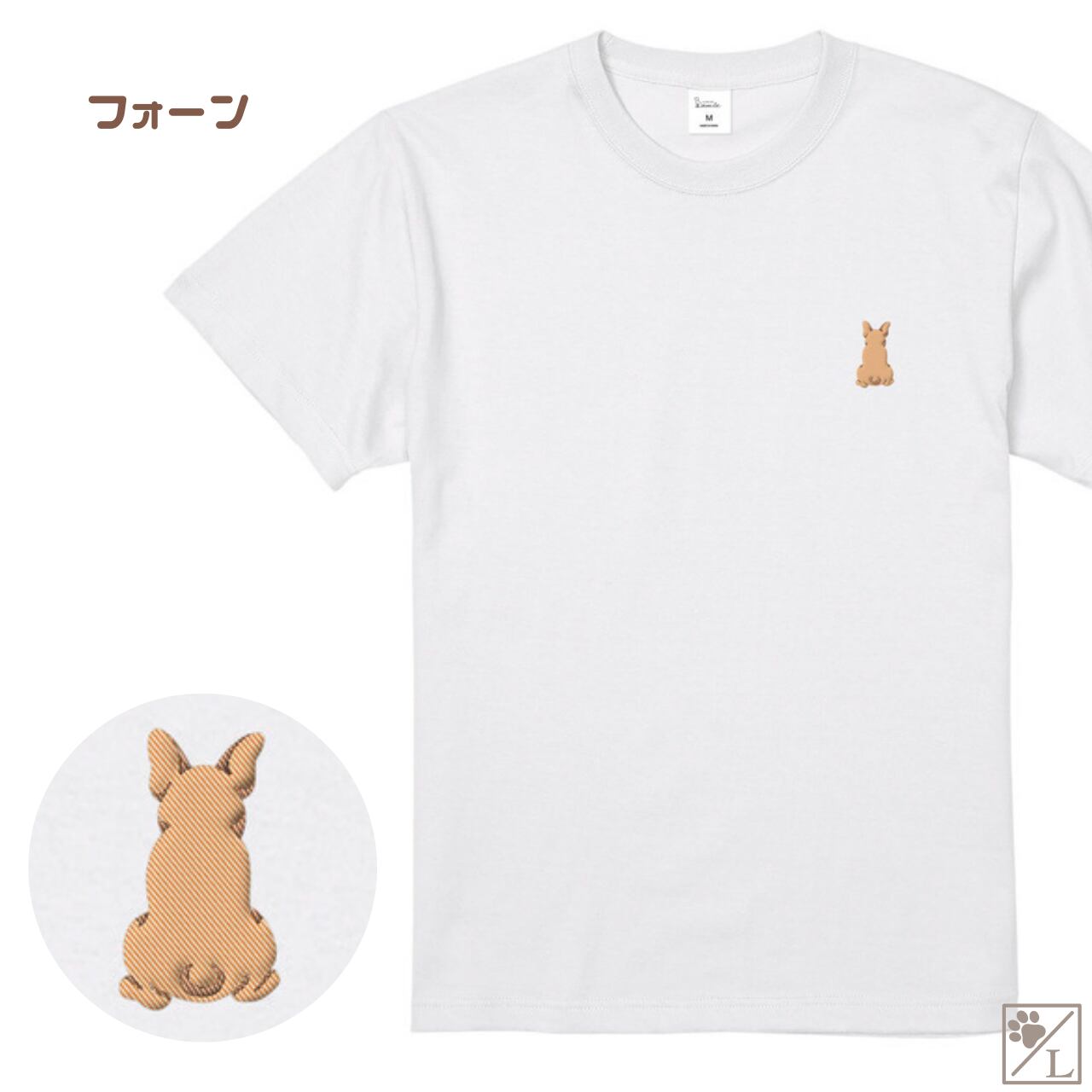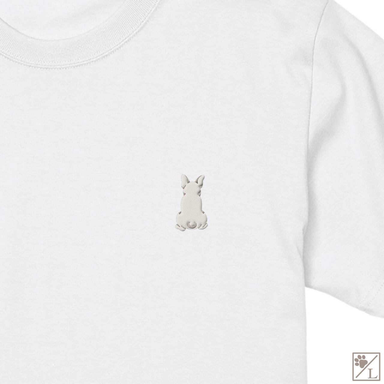 【フレンチブルドッグ】フレブル おすわり犬の後ろ姿 刺繍ワンポイントTシャツ|ユニセックス|オリジナルデザイン