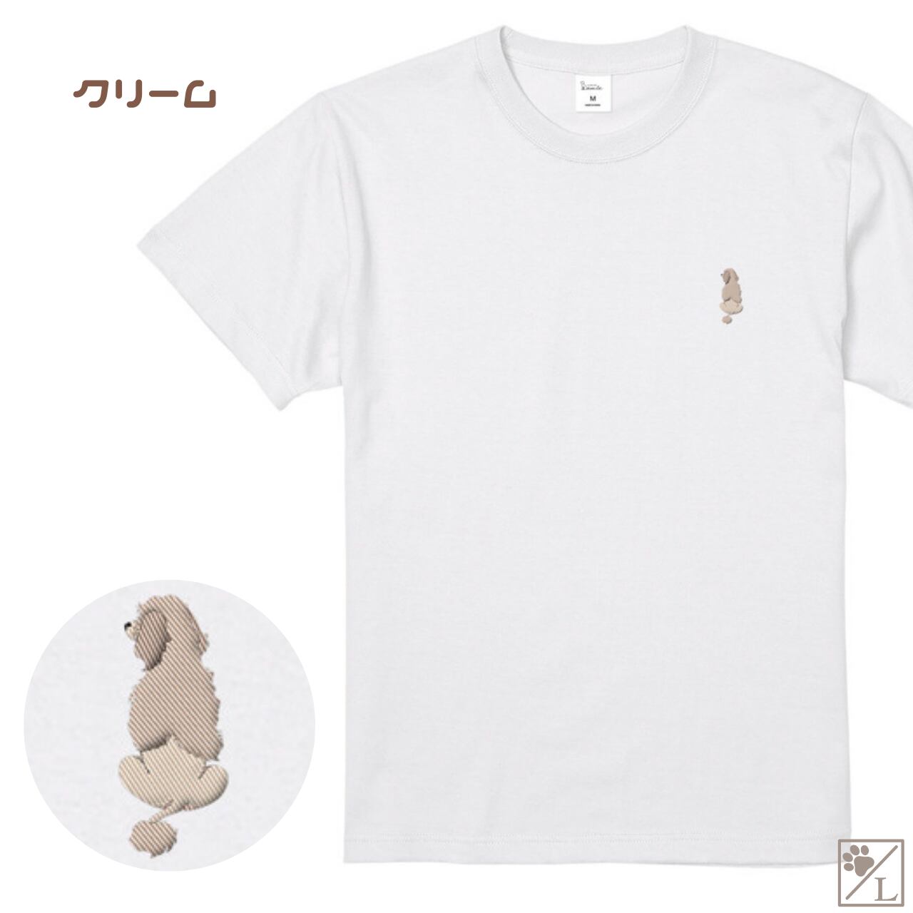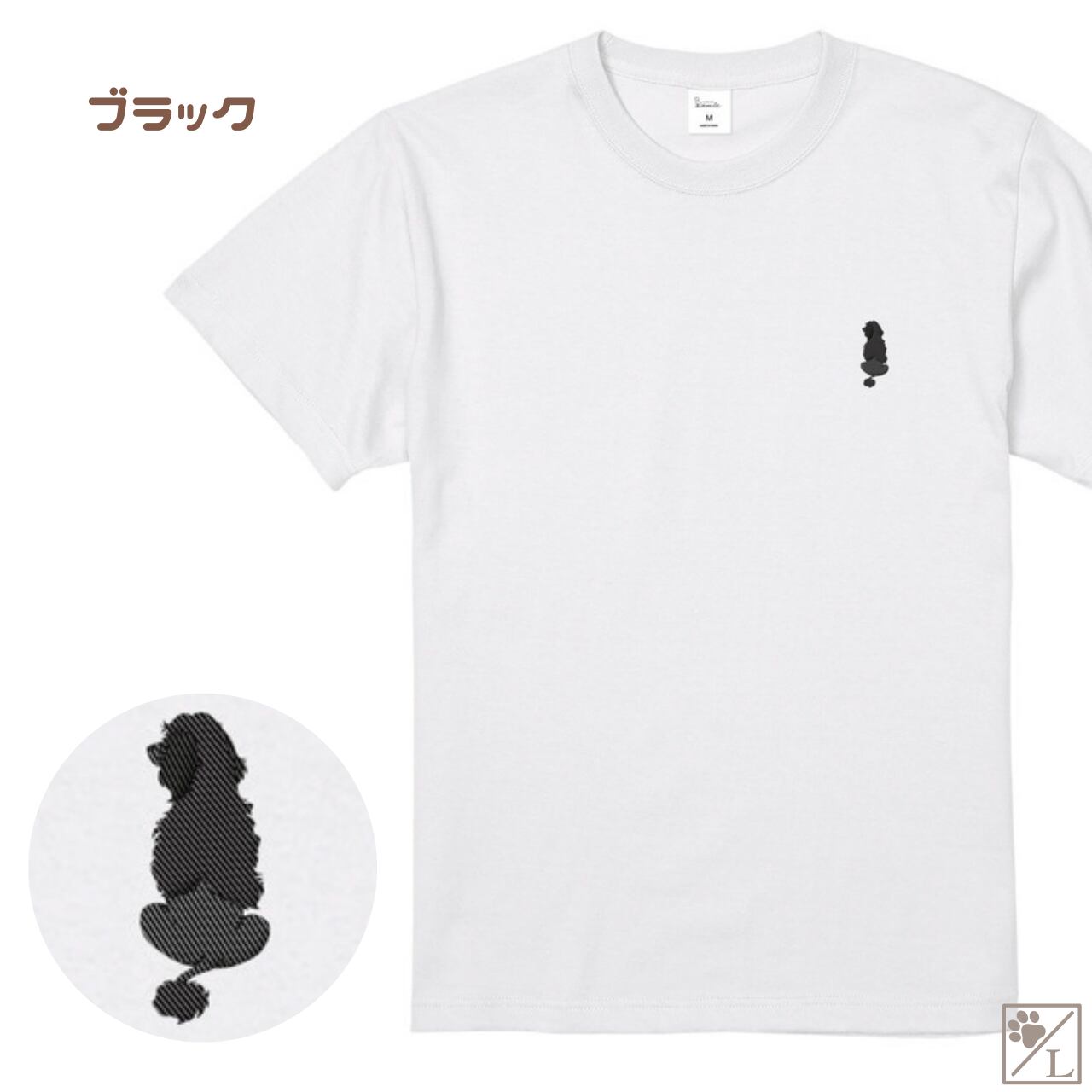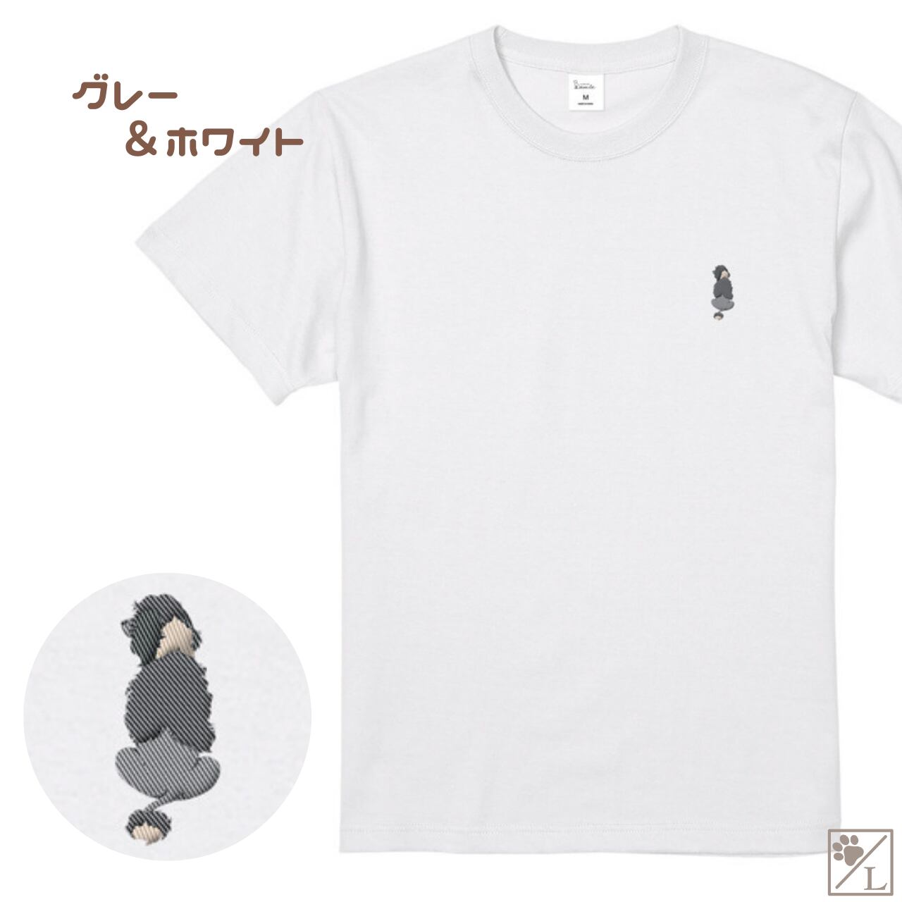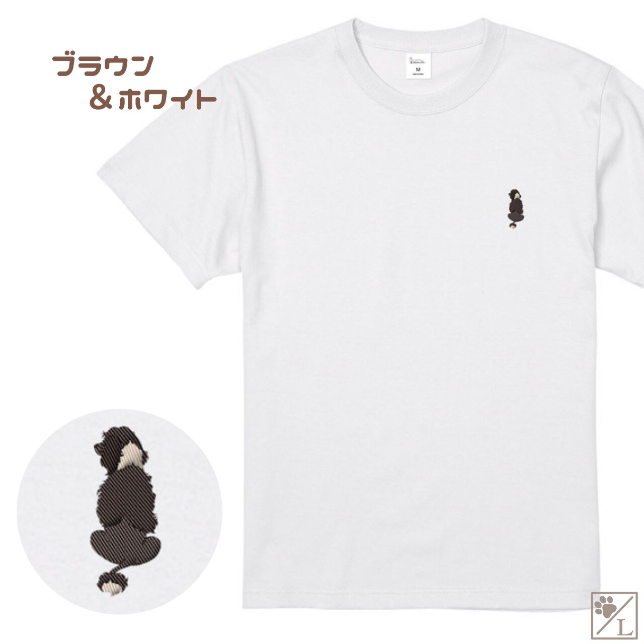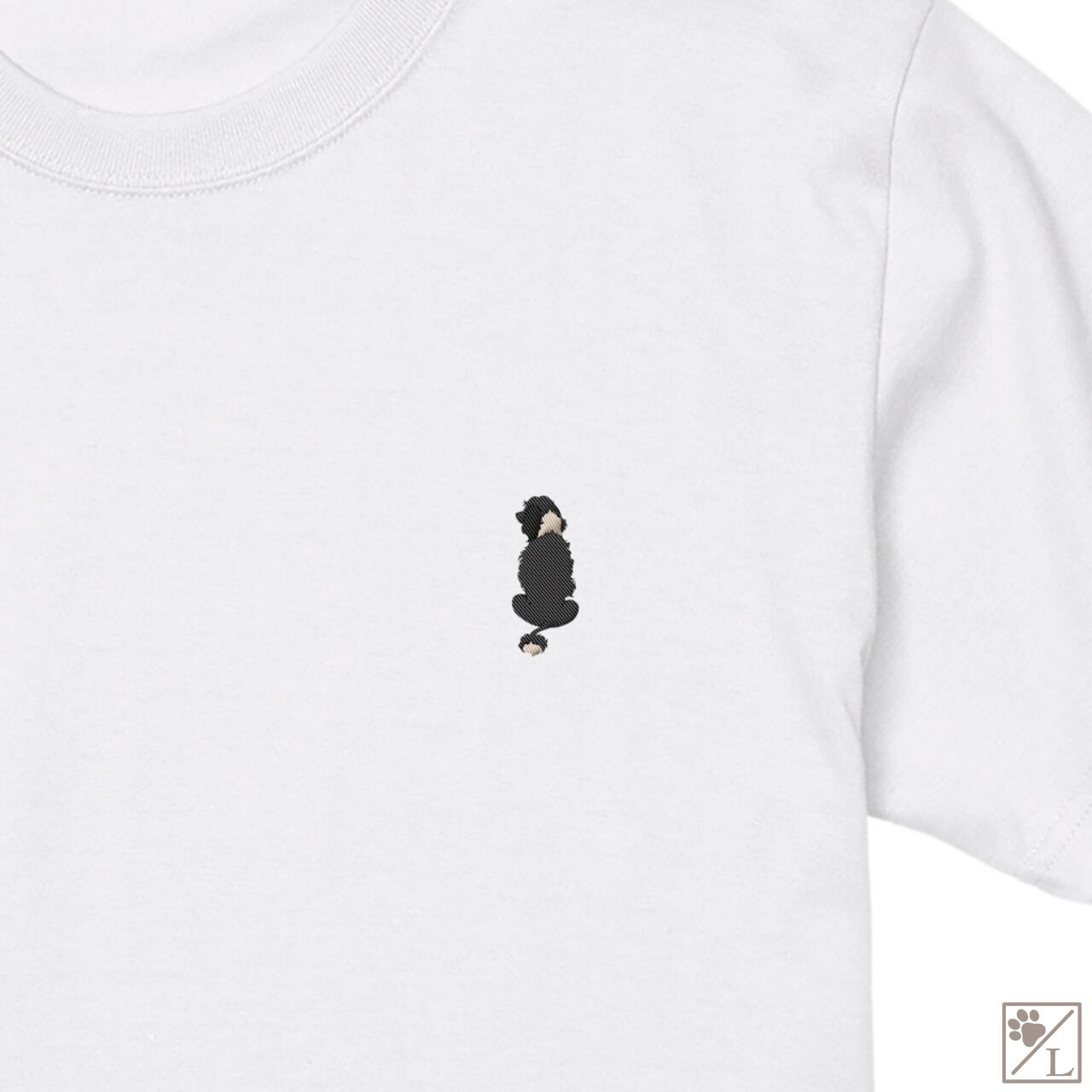 【ポーチュギースウォータードッグ】ポーティー おすわり犬の後ろ姿 刺繍ワンポイントTシャツ|ユニセックス|オリジナルデザイン