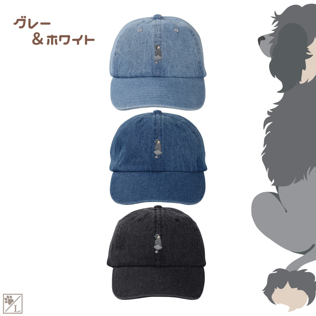 犬のおすわり後ろ姿を刺繍であしらった、シンプルで使いやすいデニムキャップ&ハットです。